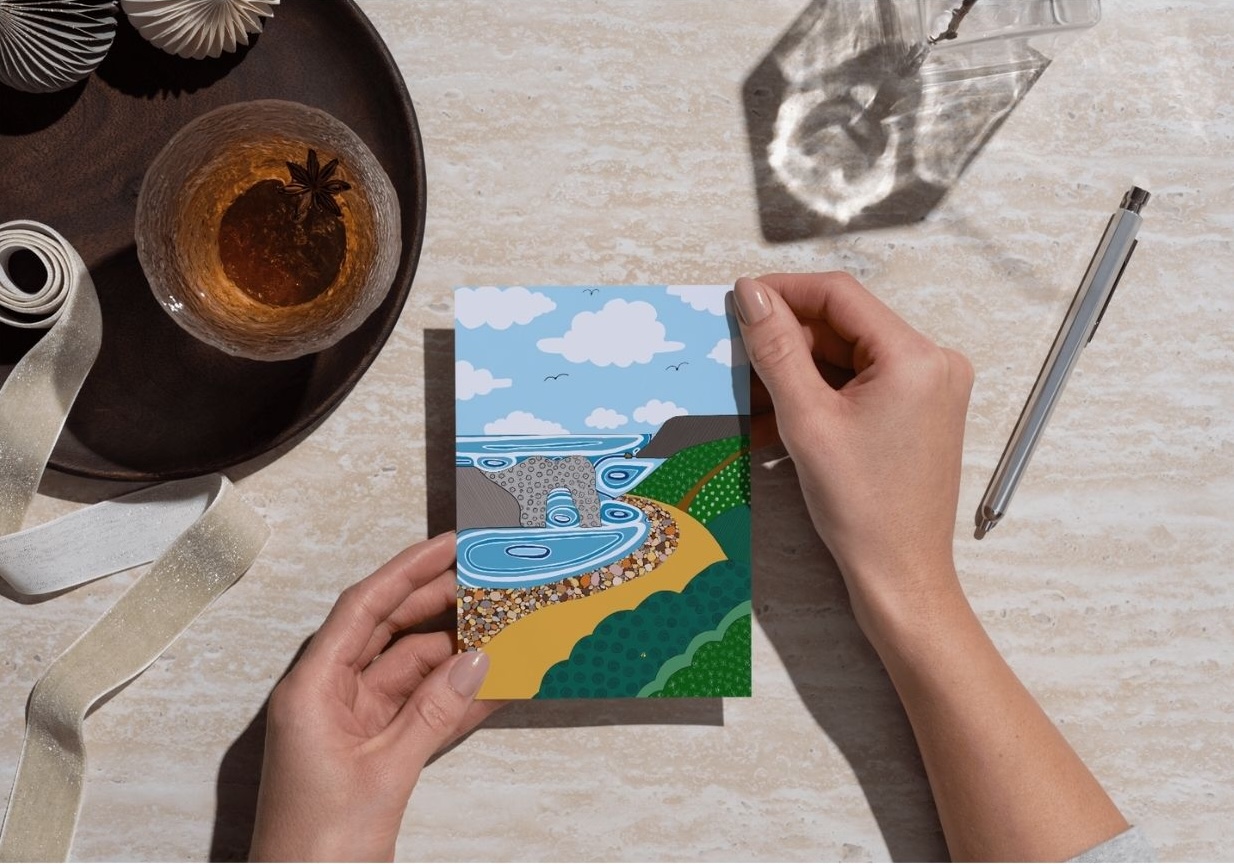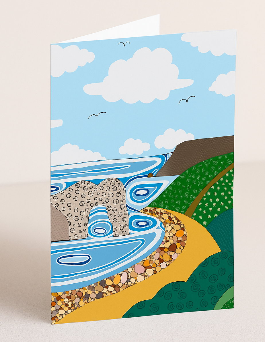Durdle Door/ Doodle Door Design art card, designed by Rebecca Savage. A6 size (4 x 6″). Designed and printed in England and printed with eco inks onto FSC accredited card, which is fully recyclable. Supplied with a white envelope in a clear fully biodegradable wrap sleeve.