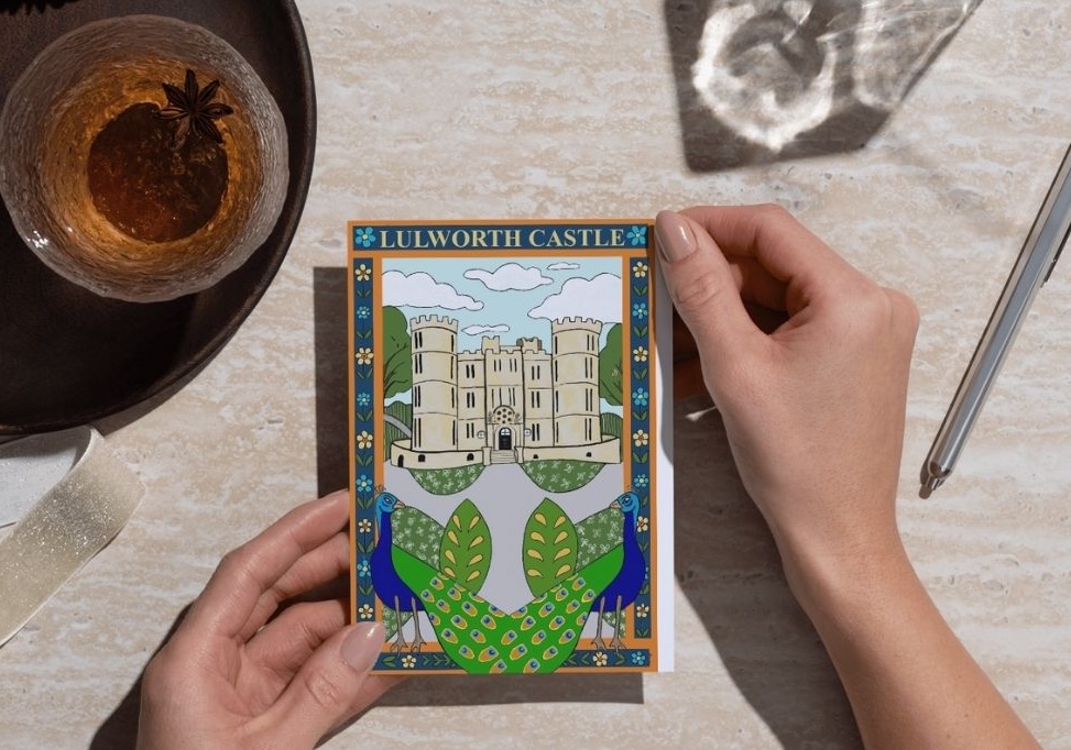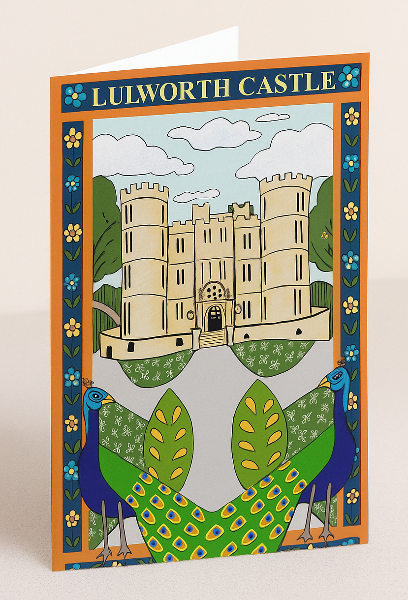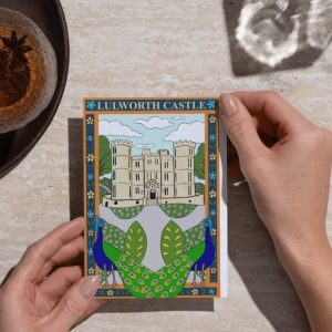 Lulworth Castle card, designed by Rebecca Savage, originally an Arcylic Painting by the designer this card design was edited using an ipad and pencil to flatten colours for a more aesthetically pleasing finish, inspired by folk art and the magnificent Lulworth Castle and Estate. A6 size (4 x 6″). Designed and printed in England and printed with eco inks onto FSC accredited card, which is fully recyclable. Supplied with a white envelope in a clear fully biodegradable wrap sleeve.